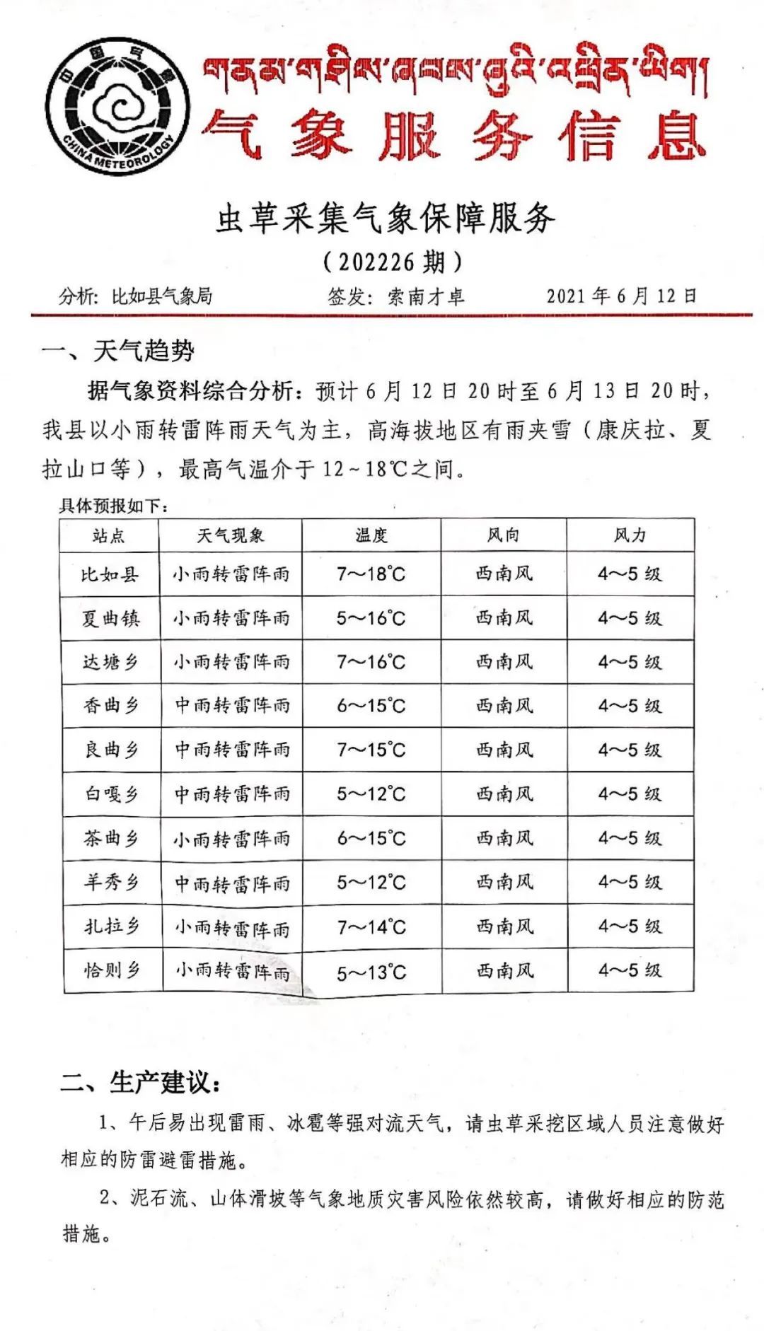 分析:比如縣氣象局   簽發(fā):索南才卓 2021年6月12日